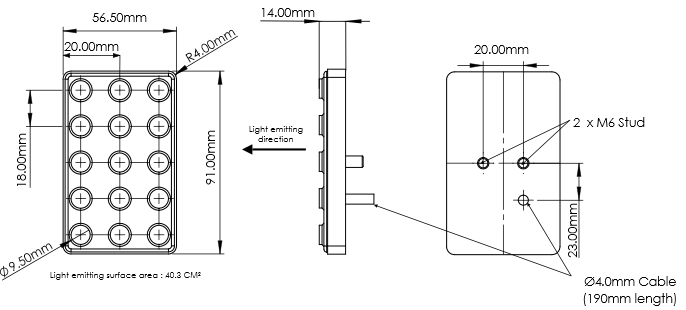 Size: Length = 91.0mm, Width = 56.5mm, Base = 14.0mm