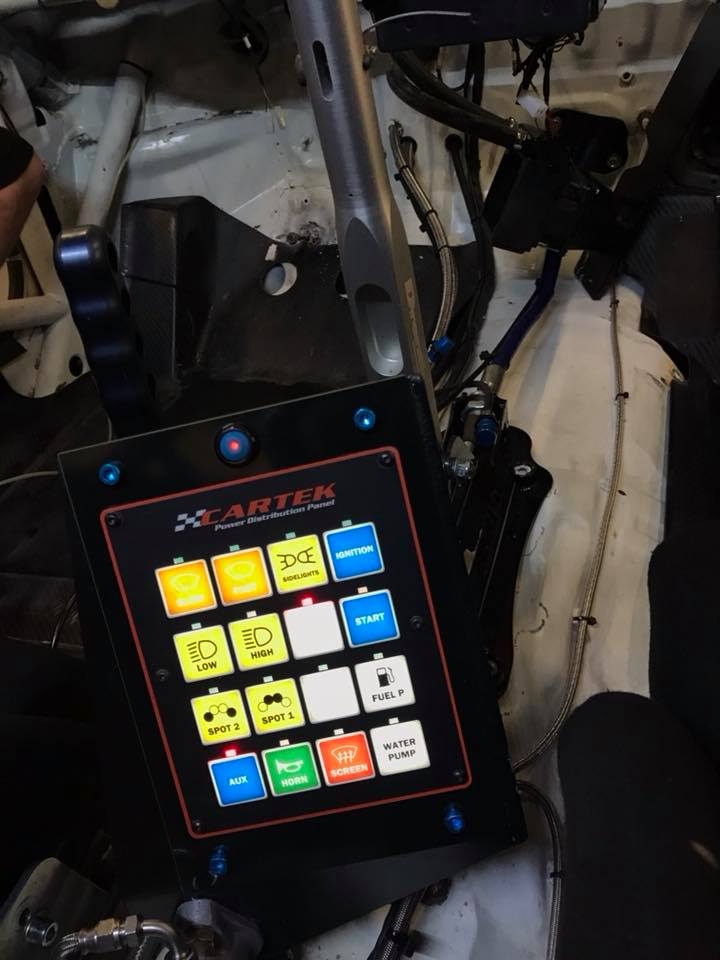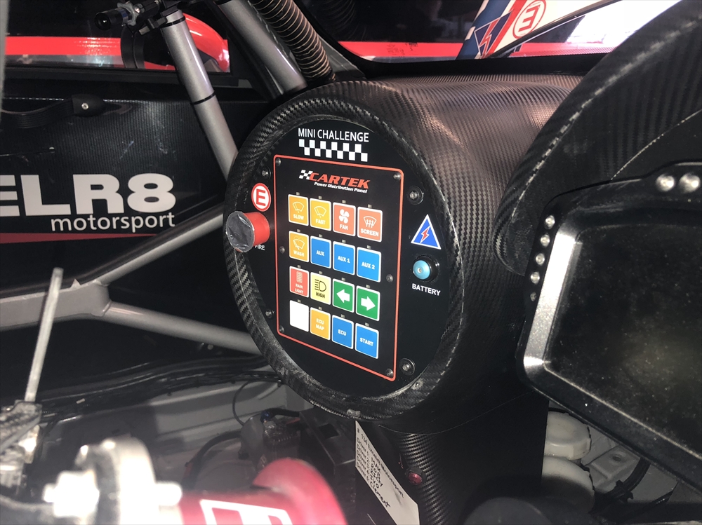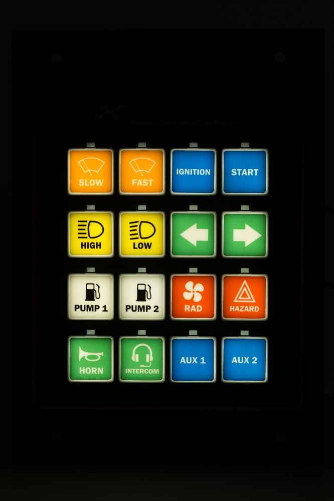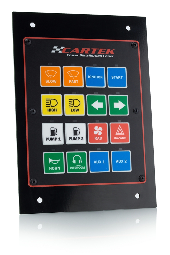 The CARTEK Power Distribution Panel is a fully integrated, fully electronic solution to power distribution in race and rally cars. Designed to replace 16 Fuses, Relays and Switches as well as a variety of control systems, these units therefore greatly simplify the wiring, reducing build time, saving weight and maximising reliability.